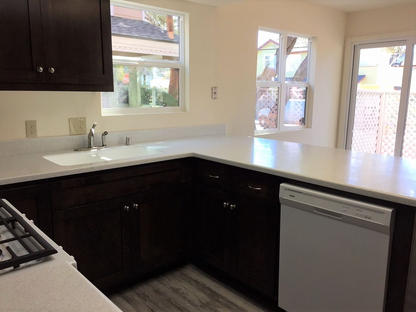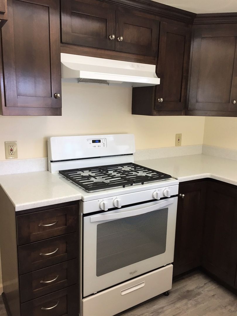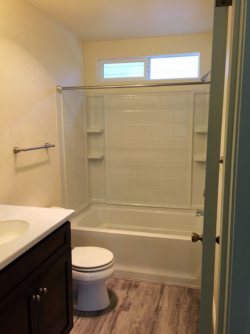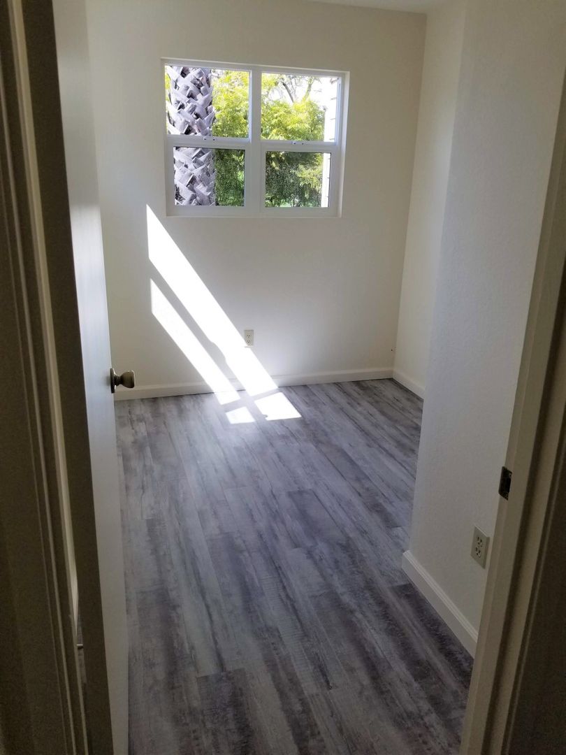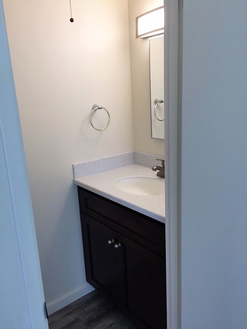 This stylish apartment is equipped with a gas oven/range and dishwasher, nice kitchen cabinets and countertops, flooring (vinyl plank and carpet), bath cabinets and countertops, fixtures and window coverings throughout. There is a coin-operated laundry room onsite for tenant use. This unit also comes with a small detached one-car garage, front patio area and a small enclosed side patio. (Photos are of similar unit)