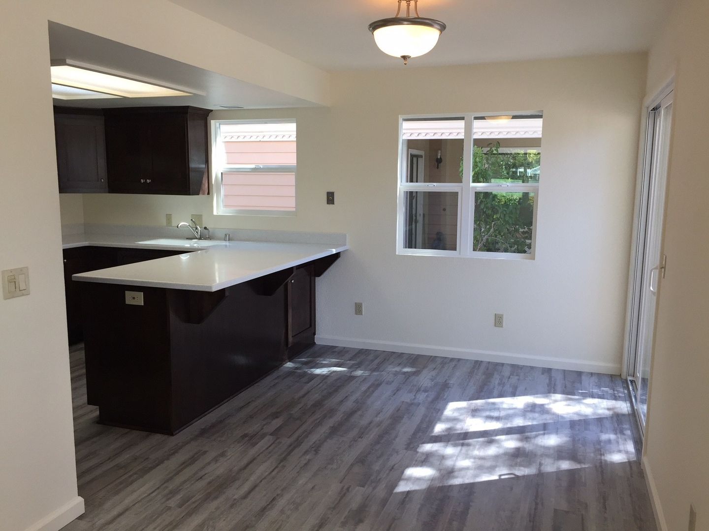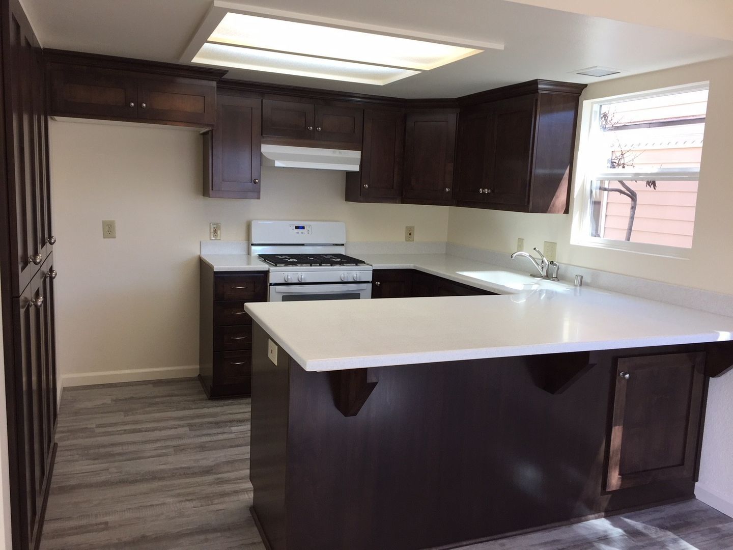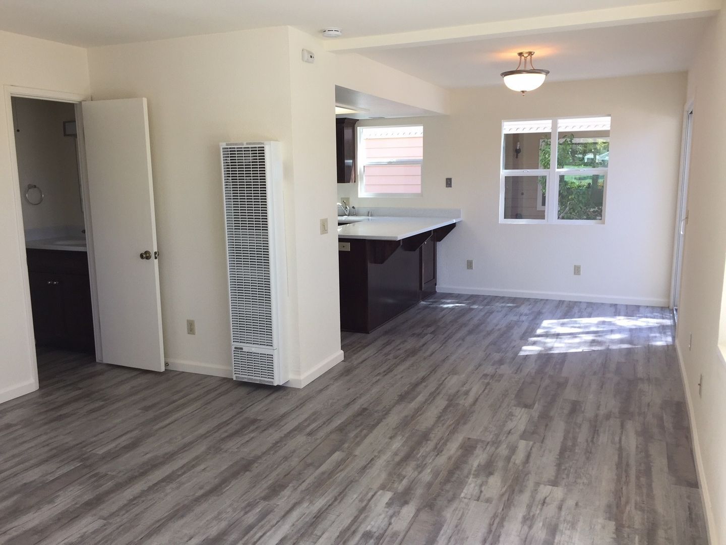 This stylish apartment is equipped with a gas oven/range and dishwasher, nice kitchen cabinets and countertops, flooring (vinyl plank and carpet), bath cabinets and countertops, fixtures and window coverings throughout. There is a coin-operated laundry room onsite for tenant use. This unit also comes with a small detached one-car garage, front patio area and a small enclosed side patio. (Photos are of similar unit)