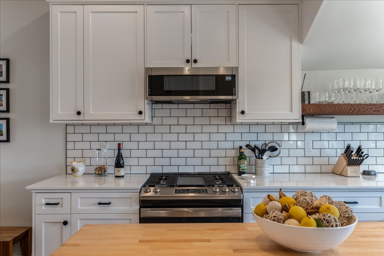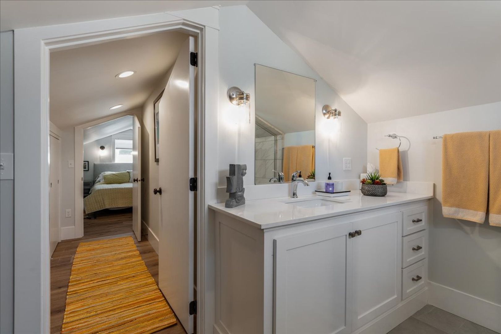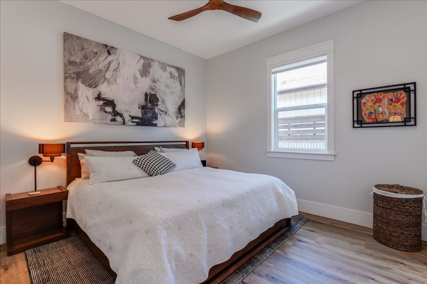 Three cozy bedrooms comfortably sleeps up to 6 guests, two bedrooms are on the main floor; first bedroom has a new King size bed, and second bedroom/office has a Queen. The Primary upstairs bedroom has a Cal King, a spacious ensuite with a walk-in tile shower and two large closets. All the furnishings throughout the home are new, and the décor is a collaboration with a local designer.